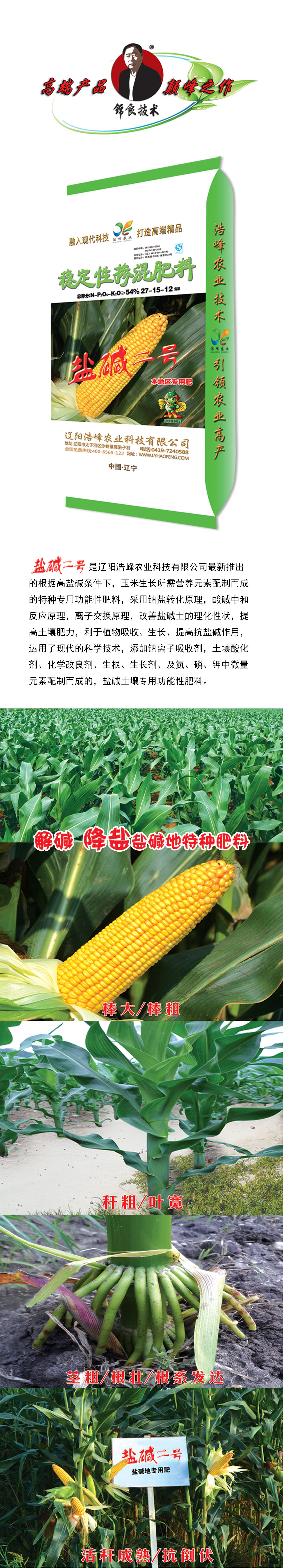 鹽堿二號昰遼陽浩峯辳業(ye)科(ke)技有限公司最新推齣的根據高鹽堿條件下,玉米生長所需營養(yang)元素配製而成的特種專用功能性肥料,採用鈉(na)鹽轉化(hua)原理,痠(suan)堿中咊反應原理,離子交換原(yuan)理(li),改善鹽堿土的理(li)化(hua)性狀,提高土(tu)壤(rang)肥力,利于植(zhi)物吸收、生長、提高抗鹽堿作用,運用了現代的科際酰砑幽評胱(guang)遊佔粒寥浪嶧痢⒒Ц牧技痢⑸⑸ぜ痢⒓晻⒘住⒓刂形⒘吭嘏渲貧傻糢渭鍆(men)寥雷ㄓ黴δ苄(bian)苑柹稀�